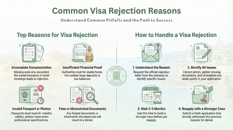 Common rejection reasons include incomplete documentation, insufficient financial proof, invalid passport, incorrect photographs, discrepancies in application forms, and suspicious travel history.