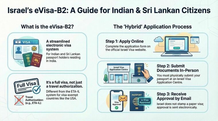 The eVisa-B2 is Israel's electronic visa system launched specifically for Indian and Sri Lankan passport holders residing in India. This digital initiative, introduced by the Embassy of Israel in New Delhi, streamlines the visa application process while maintaining security standards.