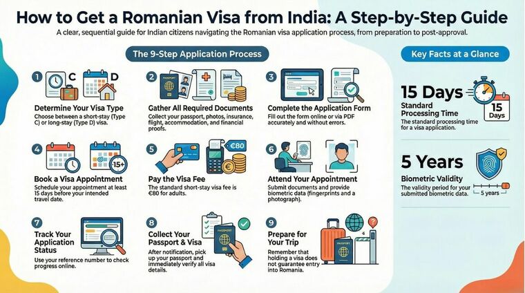The standard short-stay Schengen visa (Type C) allows Indian travelers to stay in Romania and other Schengen countries for up to 90 days within any 180-day period. The visa application process typically takes 15 calendar days, with fees starting at €80 (approximately ₹7,280) for adults.