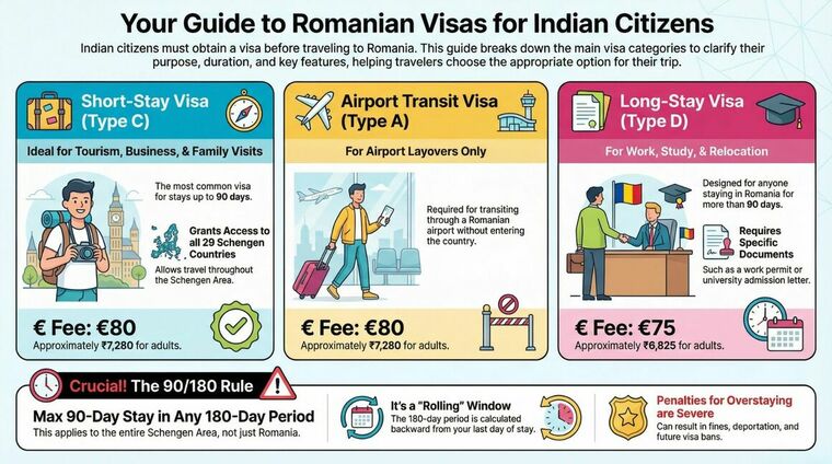 The Type C visa is the most common visa for Indian tourists, business travelers, and those visiting family or friends in Romania. This uniform Schengen visa allows stays of up to 90 days within any 180-day period.